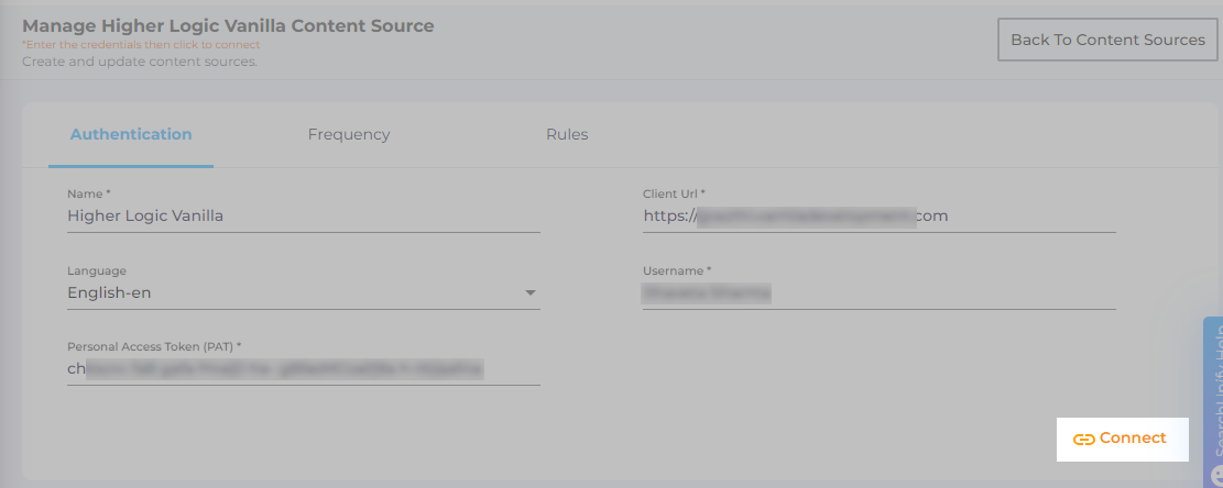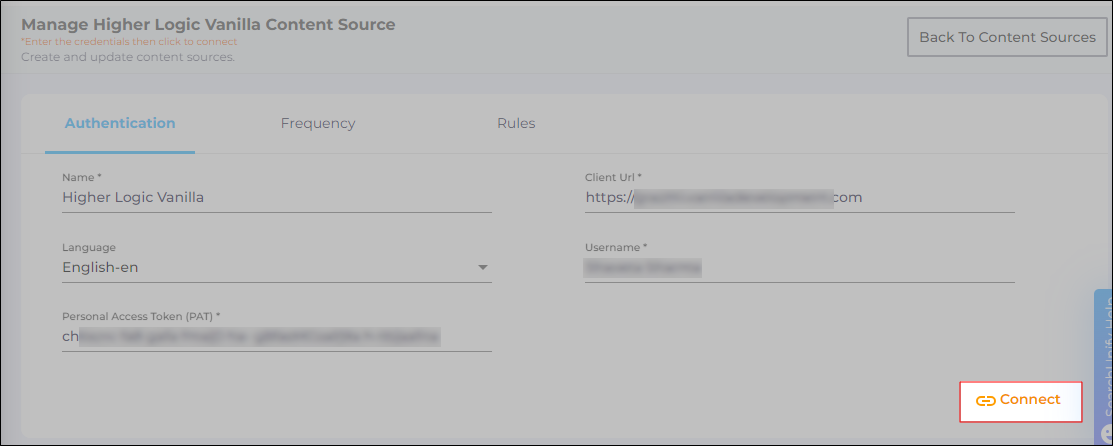 In both cases, the Content Source connection must be authenticated again. To reauthenticate a Content Source, enter the authentication details, and click Re-Connect.