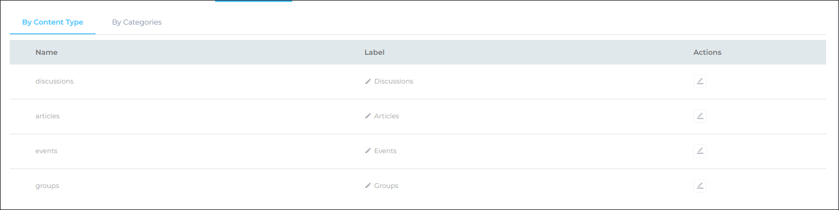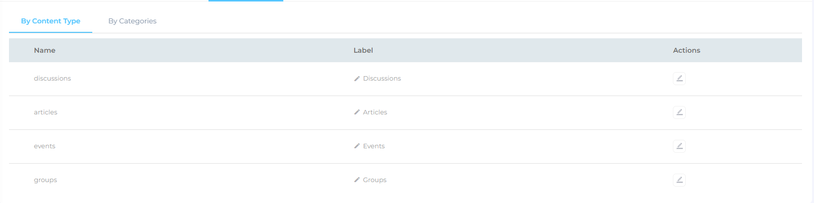 You can see the discussions, articles, events, and groups are already added. Click on the edit button from the Actions column to view and edit the pre-configured fields.