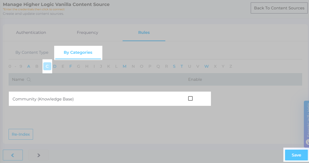 Use the checkbox to select the categories for indexing. Click Save once done.