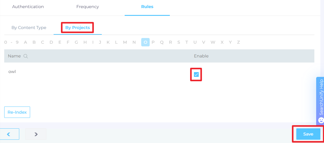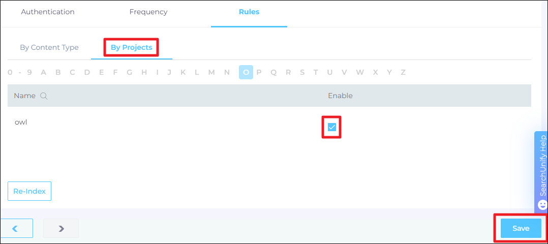 Switch to By Projects subtab. Use the alphabetical index to find and select the projects you want to index.