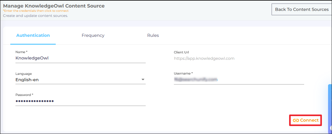 In both cases, the Content Source connection must be authenticated again. To reauthenticate a Content Source, enter the authentication details, and click Re-Connect.