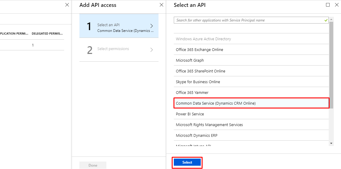 - Pick Common Data Service (Dynamics CRM Online) and then click Select.