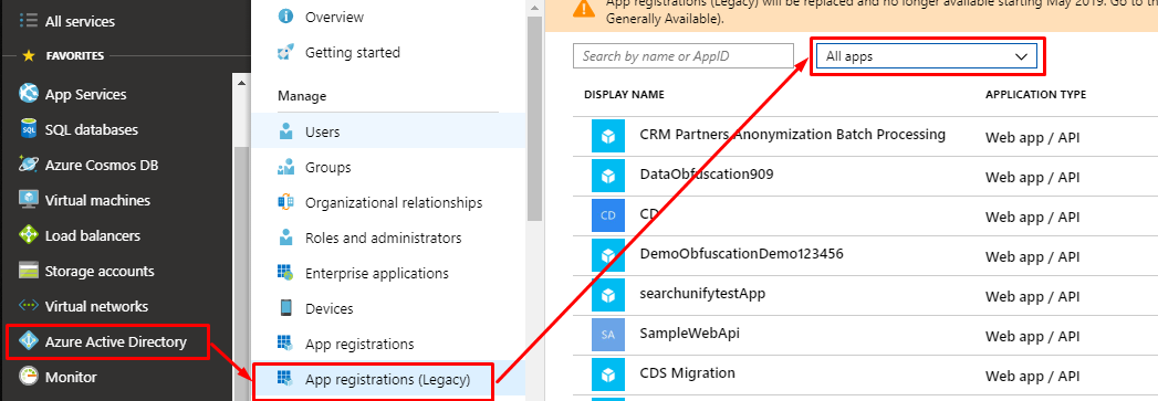 - Click Azure Active Directory, followed by App Registrations (Legacy), and select All apps from the dropdown.