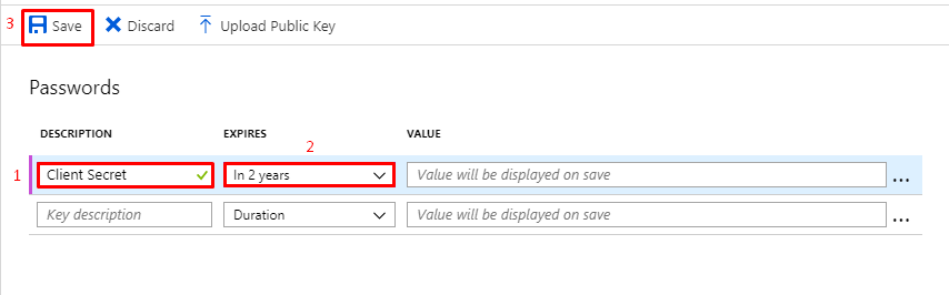 - Enter a name in Description, select when the password will expire in Duration and click Save.