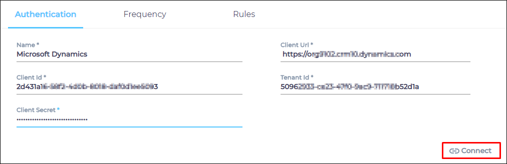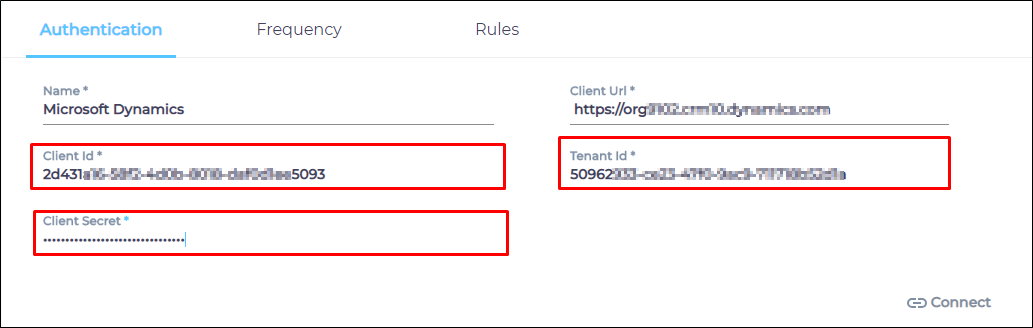 - Client ID, Tenant ID, and Client Secret were generated when you created an OAuth 2.0 app in Microsoft Dynamics. (Prerequisites). Enter them all.