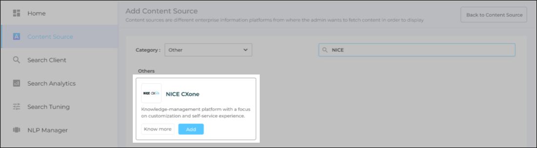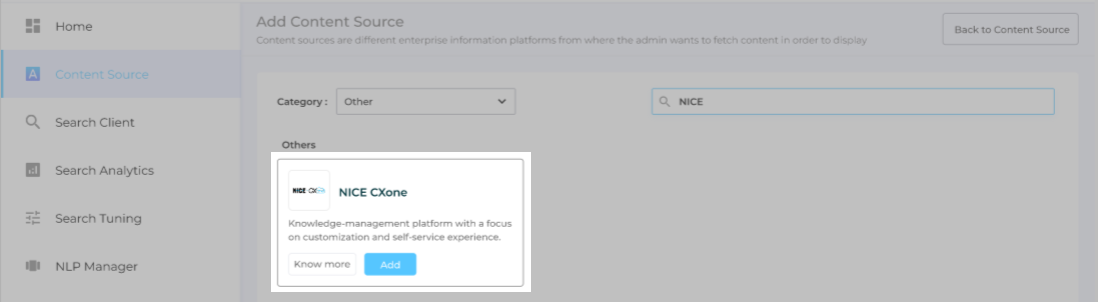 You have successfully added NICE CXone as a content source in SearchUnify. Perform a manual crawl to start indexing data in SearchUnify.