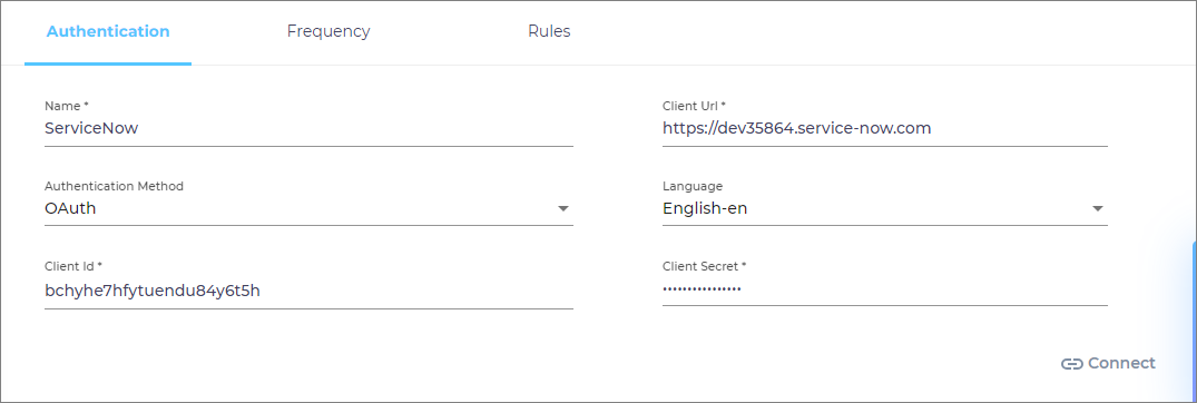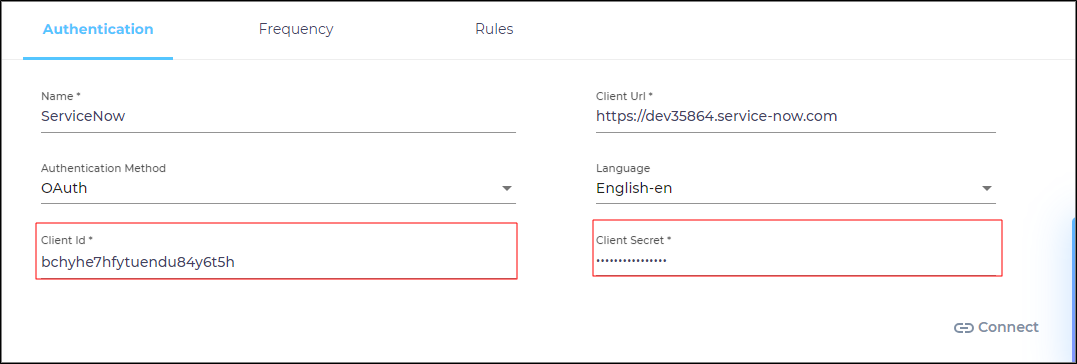 If you have selected OAuth, enter your ServiceNow Client ID and Client Secret. Follow the instructions in Prepare Your ServiceNow Instance for OAuth Authentication to learn how to generate a Client ID and a Client Secret.