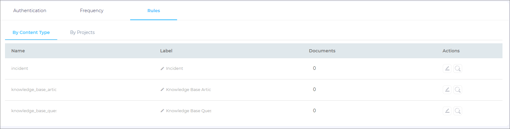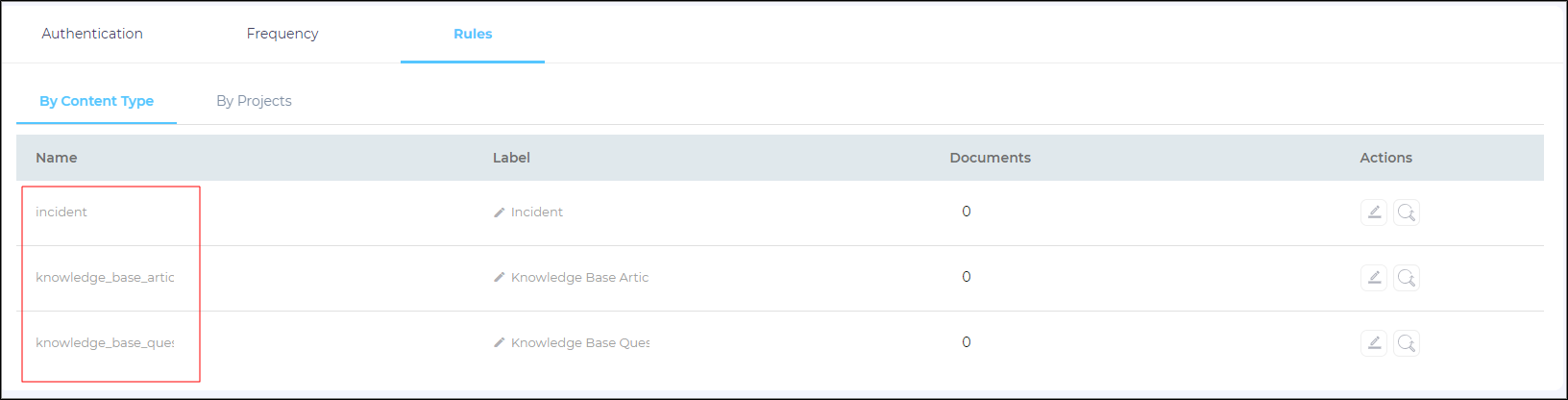 Under the Rules > By Content Type tab, you can see the three objects - incident, knowledge_base_questions, and knowledge_base_articles.