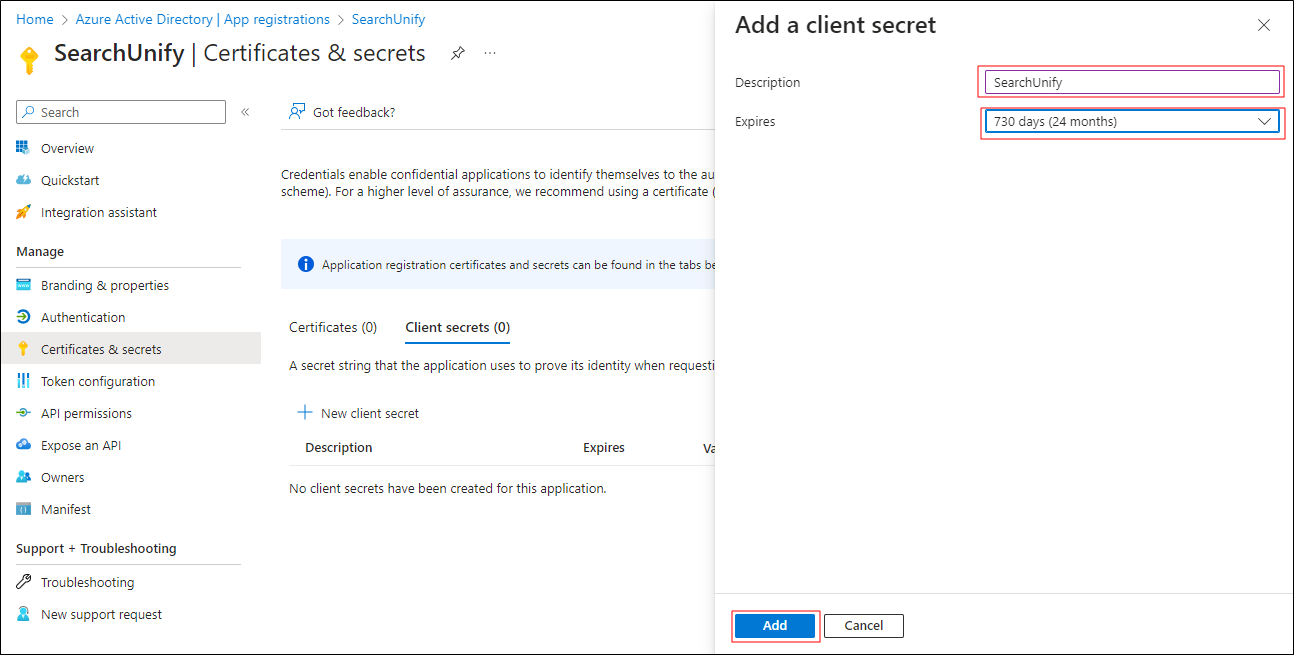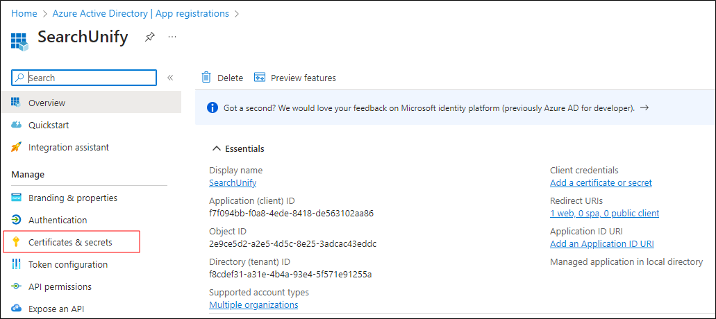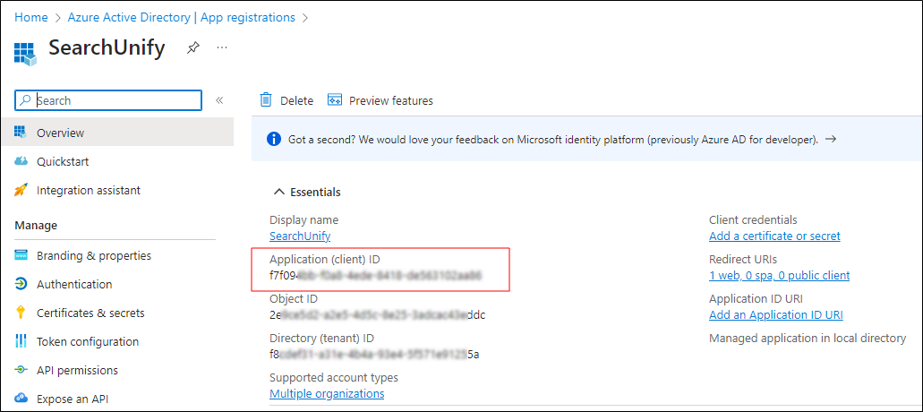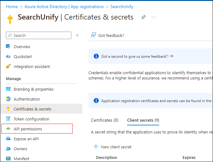 Client ID and Client Secret are required to authenticate SearchUnify-SharePoint connection through OAuth. To obtain the ID and secret, you have to create an app or authenticate an existing app, create a secret ID, and assign the app permissions.