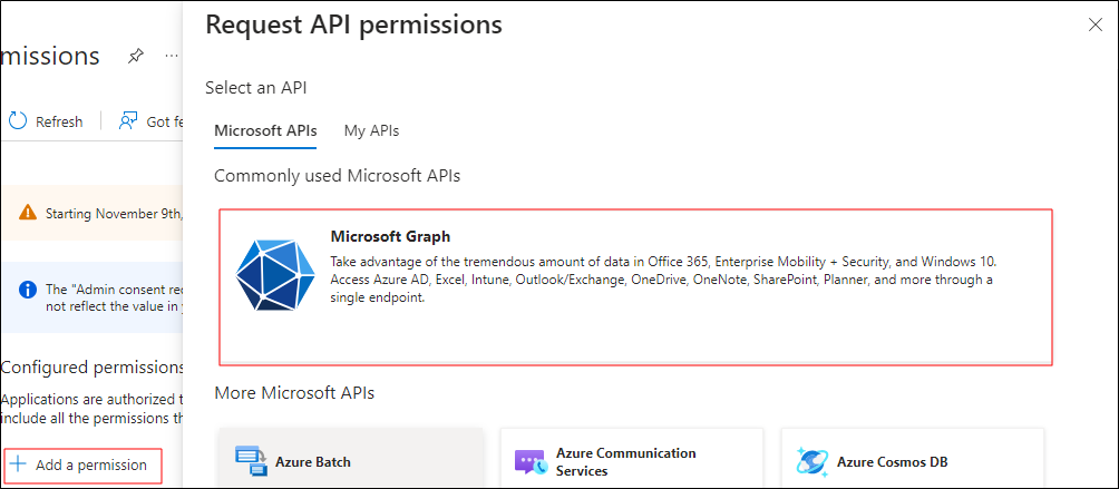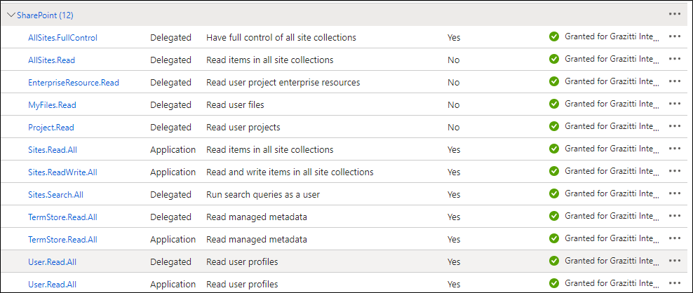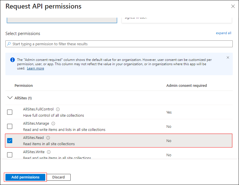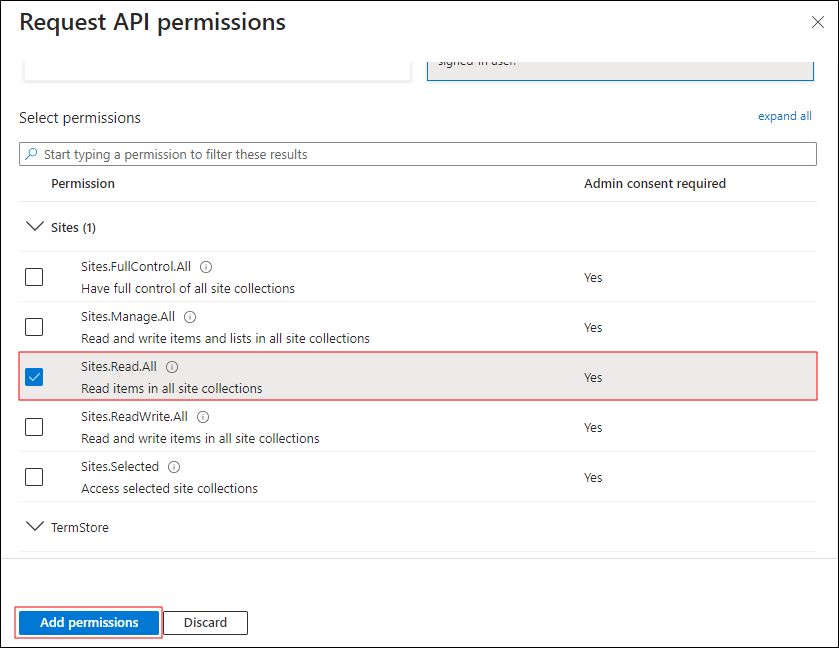 Check AllSites.Read, TeamMember.Read.All, GroupMember.Read.All, Team.ReadBasic.All, and User.Read.All. Then, click Add Permissions.