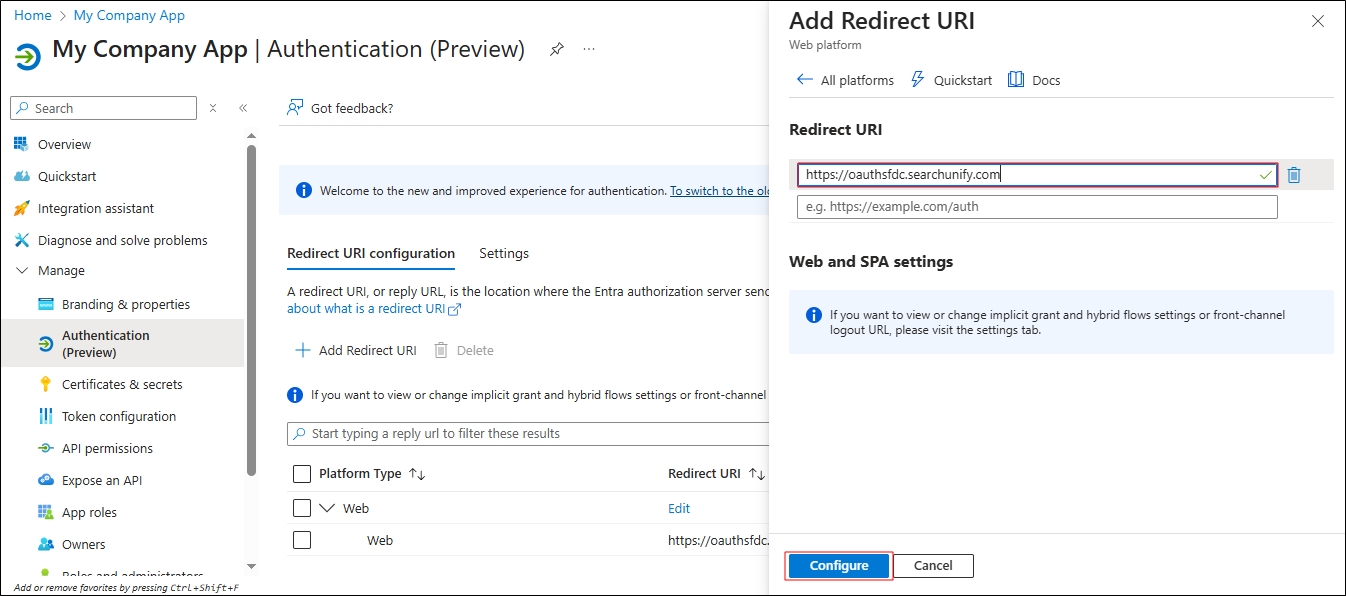 In Redirect URI, add https://oauthsfdc.searchunify.com, and click Configure.