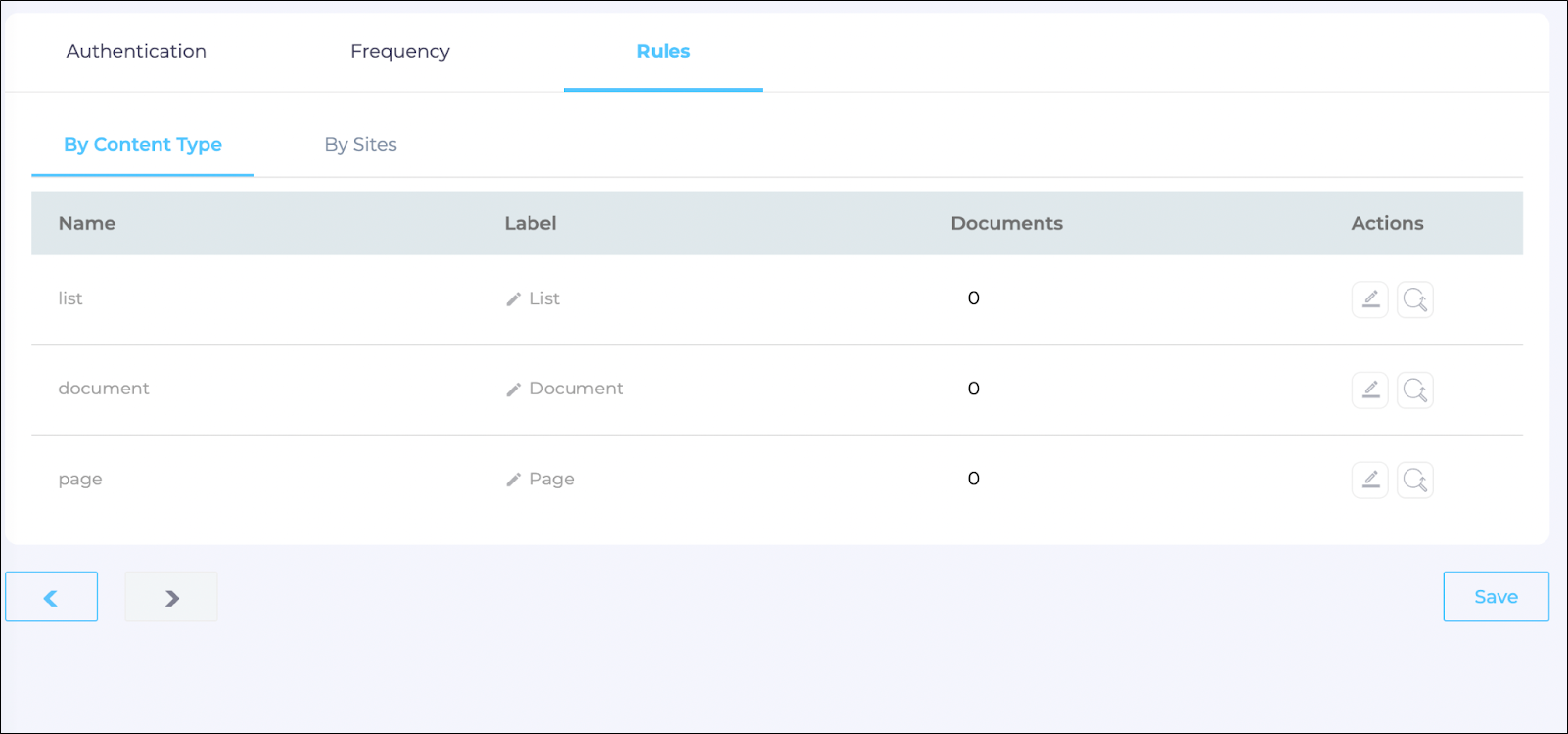 SearchUnify can index three SharePoint content types: list, page, and document. Under the Rules tab, you will land on By Content Type subtab. You can further define which properties (content fields) of these content types are to be indexed.