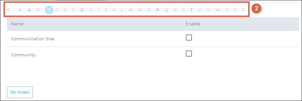 - Navigate to By Sites subtab and use the alphabetical index to find and select your SharePoint websites that you want to index.
