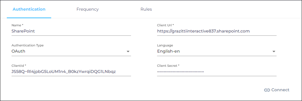 Selecting OAuth required you to enter Client ID and Client Secret. This article explains how to Obtain Client ID and Client Secret for SharePoint Authentication .