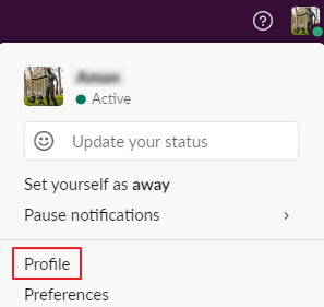 Log into your Slack Workspace and click your profile picture in the top right.
