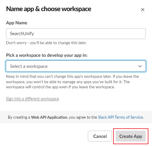 Label your app in Give Name. From Pick a workspace to develop your app in, select a Slack workplace. Finally, hit Create App.