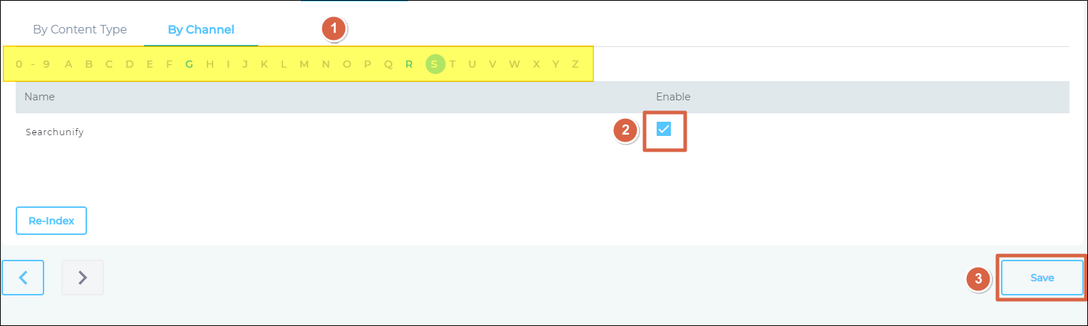 - Use the index to find your channels, check the box in Enable column to index them, and click Save.