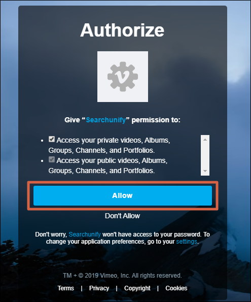 - A window will pop up asking you to let SearchUnify index your videos on Vimeo. Click Allow.