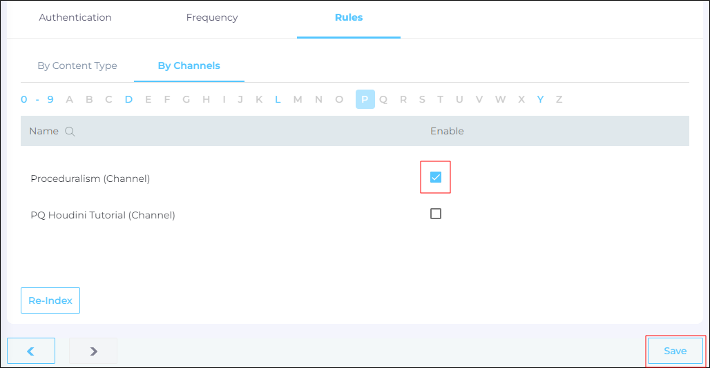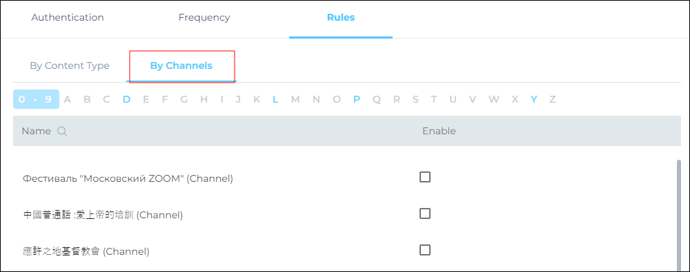 - Navigate to By Channels. All your projects and channels are listed here. Use the index to find a project or channel and check a box in Enable to select it.
