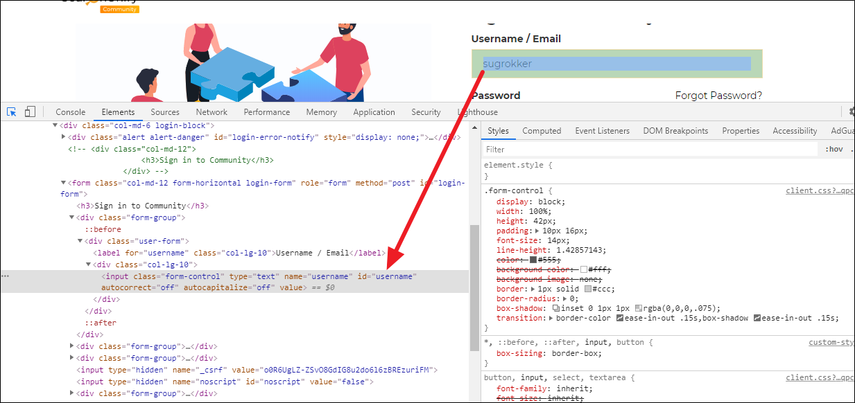 Login URL is straightforward. Chrome Users can find the CSS selectors by pressing Ctrl+Shift+I and hovering the cursor over the each field and button one at a time. In the next image, you can see the CSS selector of username, which is #username.