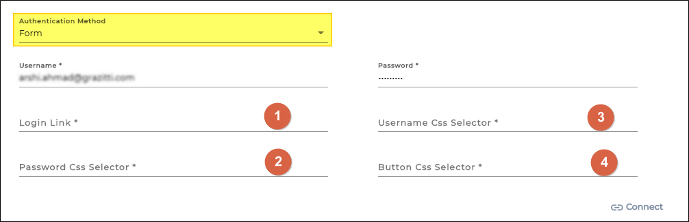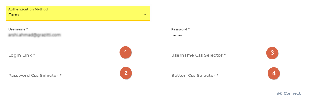 Form is an advanced version of Basic authentication and requires an acquaintance with CSS selectors to set up. This authentication type is used when a website is gated and requires the user to fill login form to access a website.