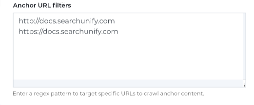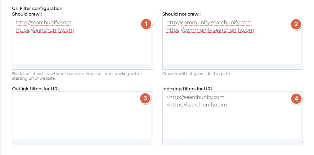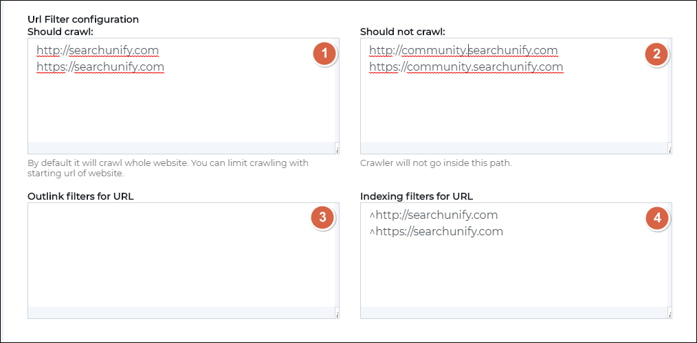 Indexing filters for URL. This feature is used to index select pages. While Should Crawl determines the pages to be crawled, Indexing filters for URL determines which pages are to be stored in SearchUnify's database or index. Ensure that you have specified Should Crawl correctly. If the crawler cannot get to page.html, then mentioning page.html in Indexing Filters for URL will not add it to the SearchUnfiy database. You can enter the URLs of the pages to be indexed or a regular expression.