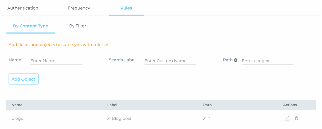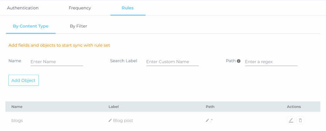The admins can write CSS selectors to specify the elements for indexing. The CSS selectors are stored in an Object, which we will create next. To begin with, navigate to the Rules tab and you will land on By Content Type subtab.