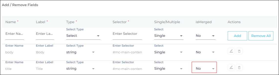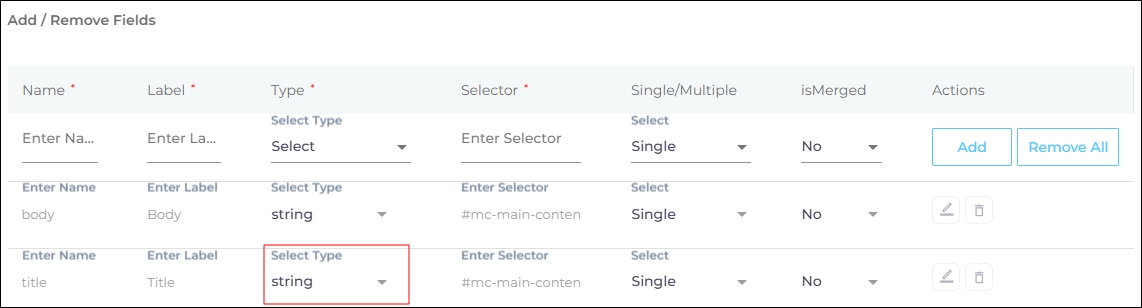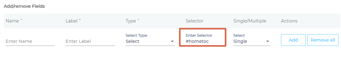 Selector is the most important field. It's used to find content for indexing. If a selector is misidentified, then the values contained in the selector will not be indexed. On a webpage, all HTML tags, classes, and IDs are valid selectors.