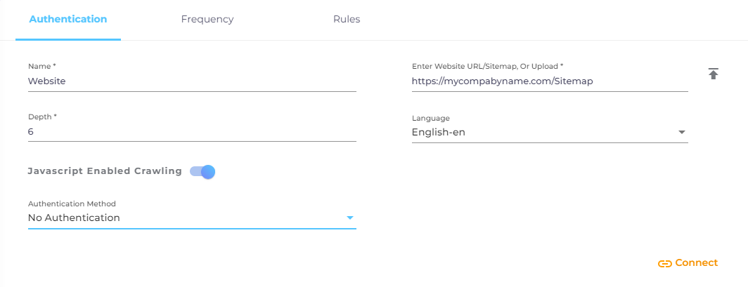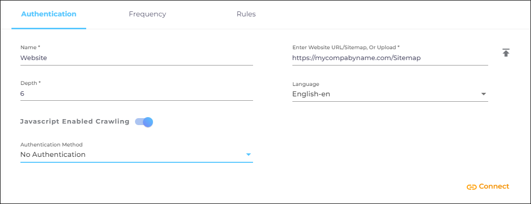 This authentication method is adequate if your website is public, such as Wikipedia or SearchUnify Docs. Public websites are accessible to everyone with an Internet connection. In this case, select No Authentication as the Authentication method and click Connect.