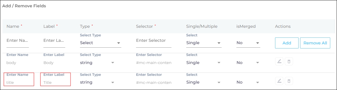 Now, choose either "All" or a specific content source field from the "Enter Name" dropdown. When "All" is selected, any value in the "Find" column is replaced with the corresponding value in the "Replace" column across all content source fields. If a particular field is chosen, the old value is replaced with the new value solely within the selected field.