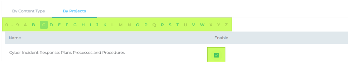 Navigate to By Projects, use the index to find projects, and check the box in Enable to index them.