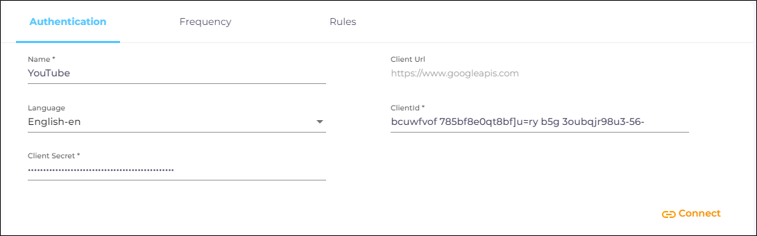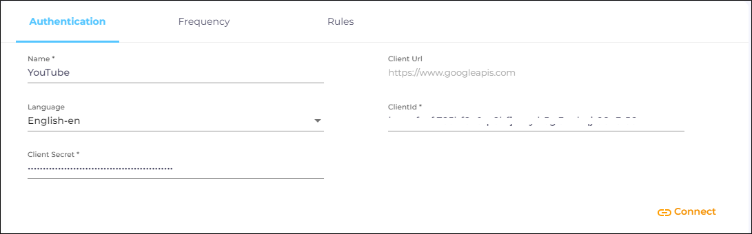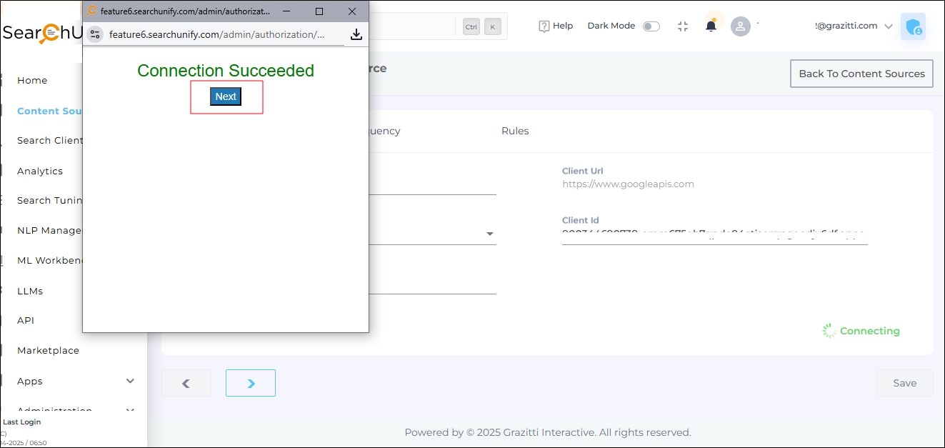 Give your content source a Name and select the content Language. Also, enter Client ID and Client Secret of your Google account. Refer to this doc on how to Obtain Google Client ID and Client Secret.