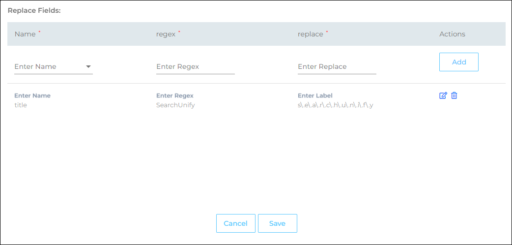 is used to find and replace values in a field. Think of it this way. Your flagship product has recently been named from "SearchUnify" to "s.e.a.r.c.h.u.n.i.f.y". You want the search result titles to display s.e.a.r.c.h.u.n.i.f.y immediately.