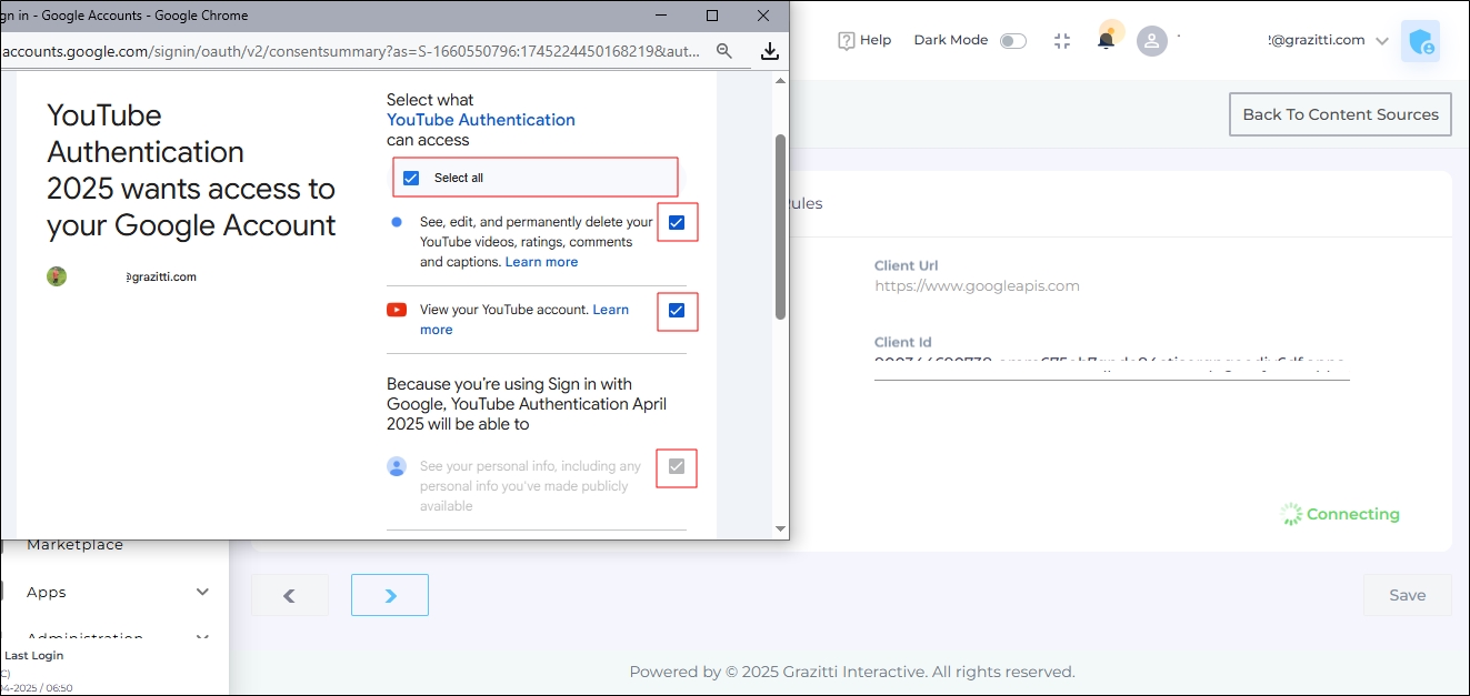 SearchUnify admins can change the scopes using the Update Permissions after authenticating a YouTube content source at least once.