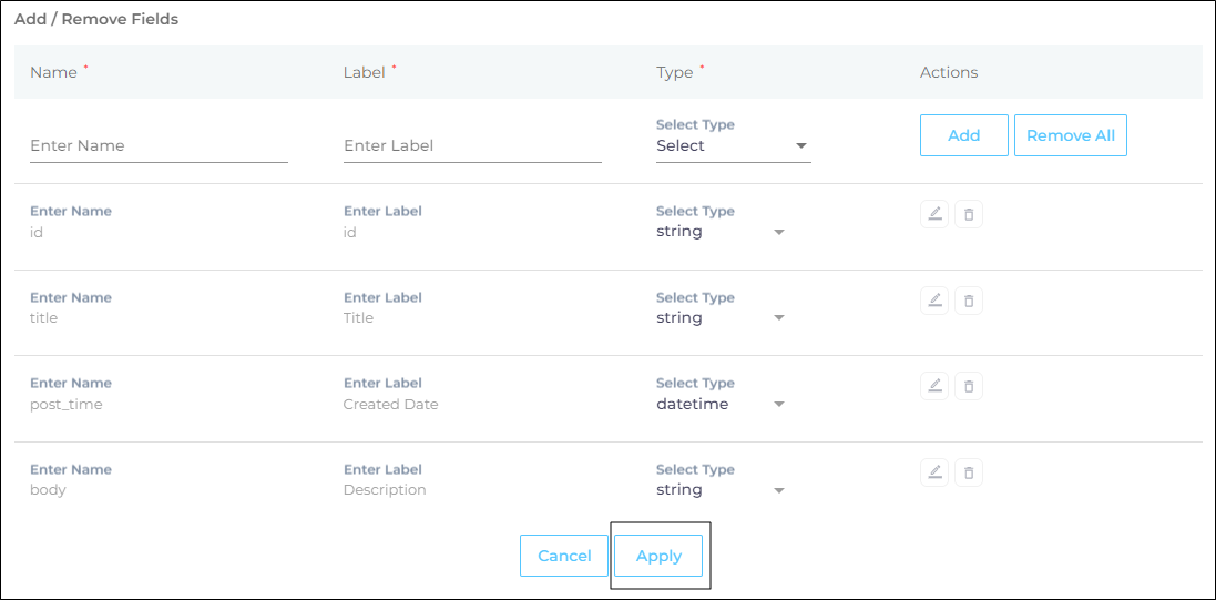 . - You will discover that all available fields have been selected. The safest path forward is to click Apply. However, if you are an advanced user or a developer, you can remove fields, such as channel_id and comment, and change the Label and Type of a field. Neither change is recommended for most users.