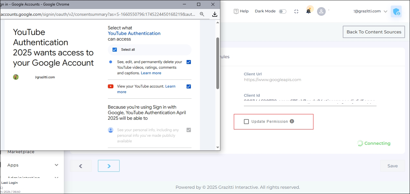 Update Permissions is displayed after a YouTube content source has been authenticated. When a user selects Update Permissions and clicks Re-Connect, a pop-up is displayed. If the user selects a new set of permissions and authenticates the content source again, then the existing permissions are cleared and updated permissions are applied.
