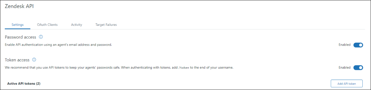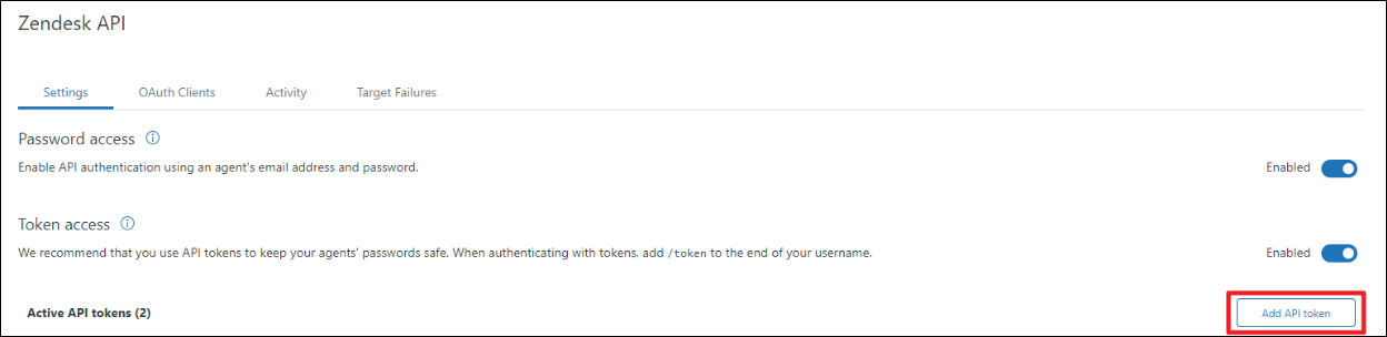 You can enter either a user password or an API token in the Password field which appears upon selecting Basic in the Authentication Method dropdown. This article shows how to get an API token from Zendesk.