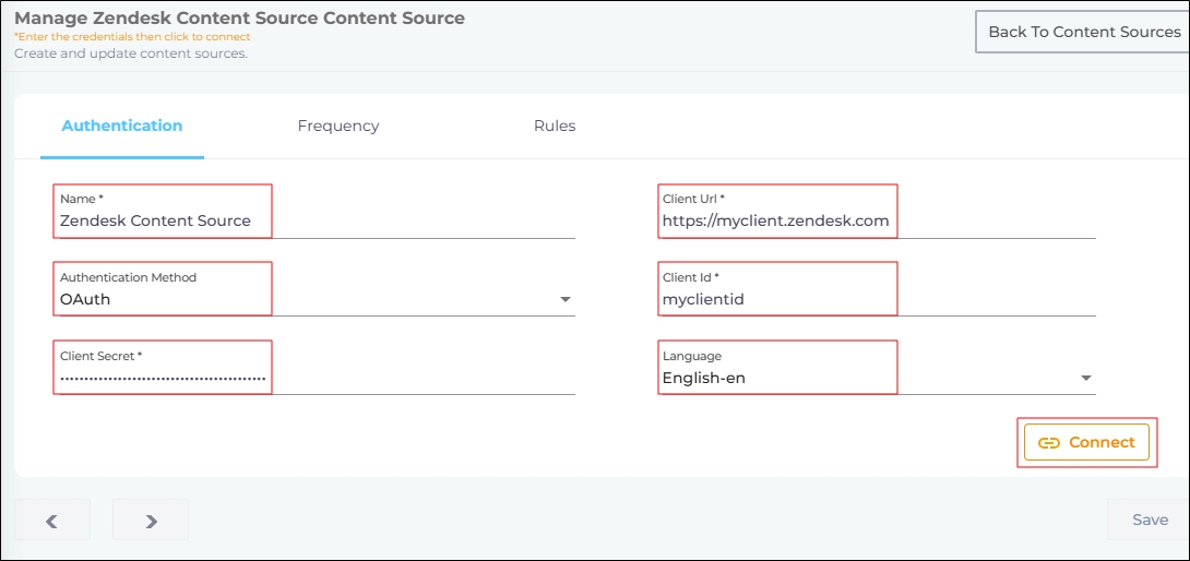 If you're using OAuth authentication, it's recommended to log into Zendesk before connecting the content source. Otherwise, you'll be redirected to the Zendesk login screen after clicking “Connect”.