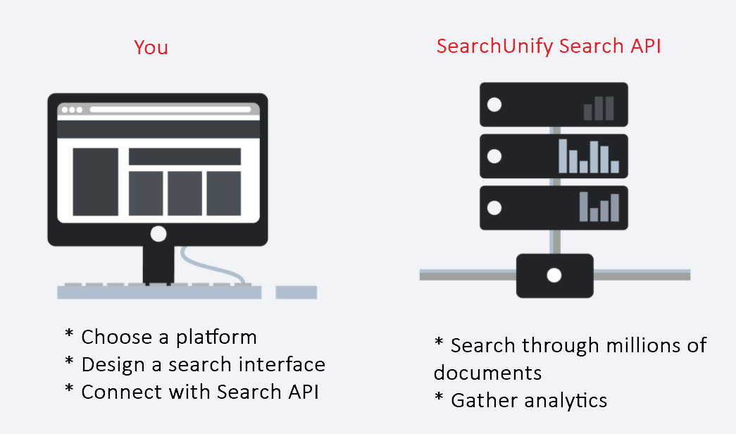 SearchUnify Search API allows teams create their own search interfaces—minimal or elaborate—on a platform of their choice all the while sticking to brand guidelines, without hobbling them with the mammoth task of designing a search engine from scratch. SearchUnify provides the latter.