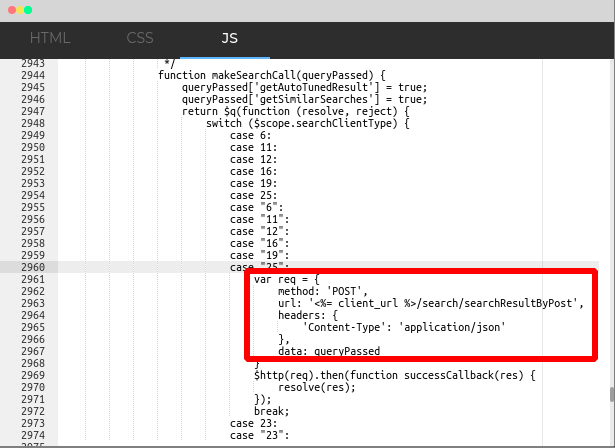 open a gated search client for customization. - In the JS tab, update the API in the functions makeSearchCall() and getAutocompleteResults().