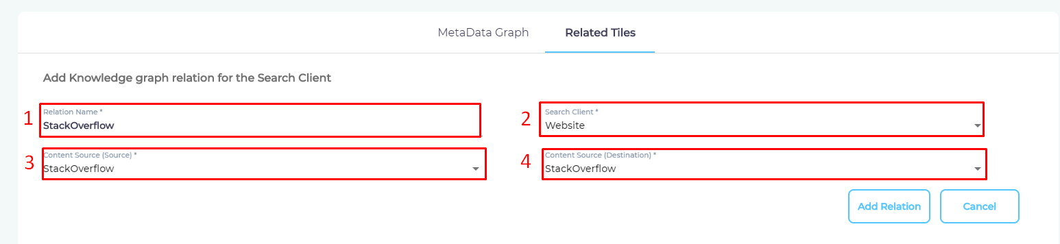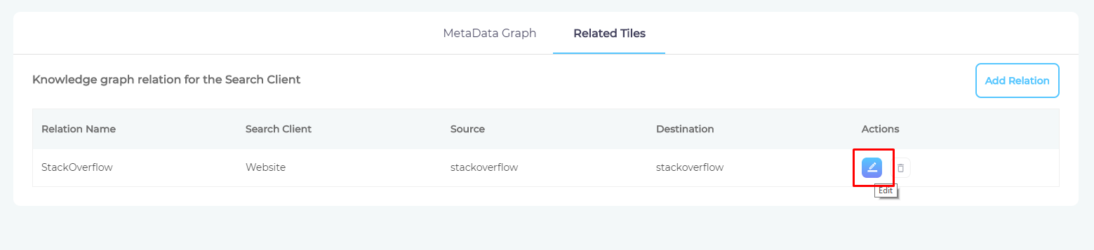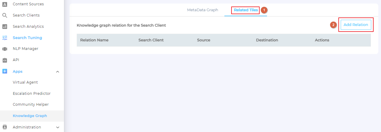 - Navigate to Related Tiles in Knowledge Graph and click Add Relation.