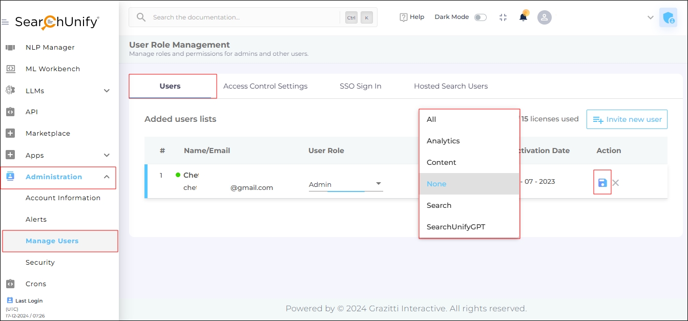 For limited access, choose Analytics, Search, Content, or SearchUnifyGPT.