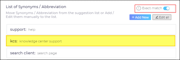 Fig. Exact Match is turned on. "kcs" is a synonym of "knowledge center support".