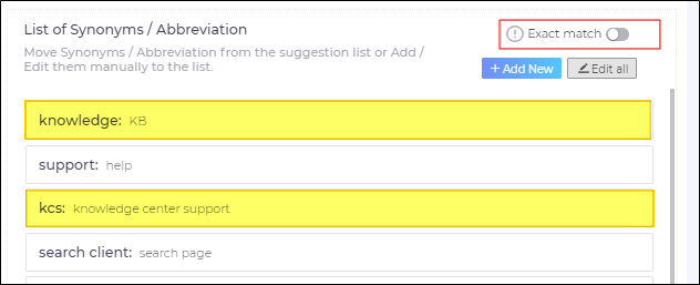 Fig. Exact Match is turned off. In the first row, "knowledge" is a synonym of "KB". In the third row,"kcs" is a synonym of "knowledge", "center", and "support." Both the rows have "knowledge" in common. Therefore, all the terms are synonyms of one another.