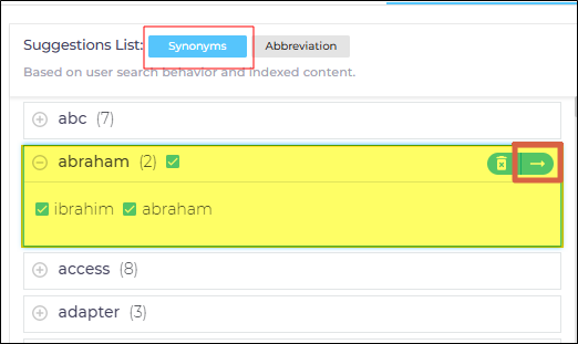 - In the Suggested List column, click the Add Synonym icon for a cluster.