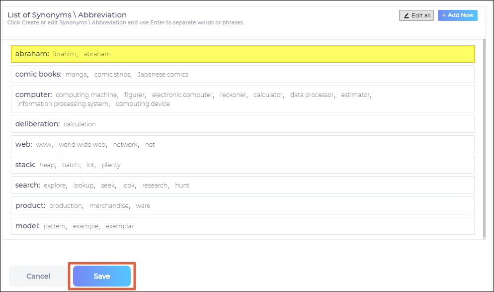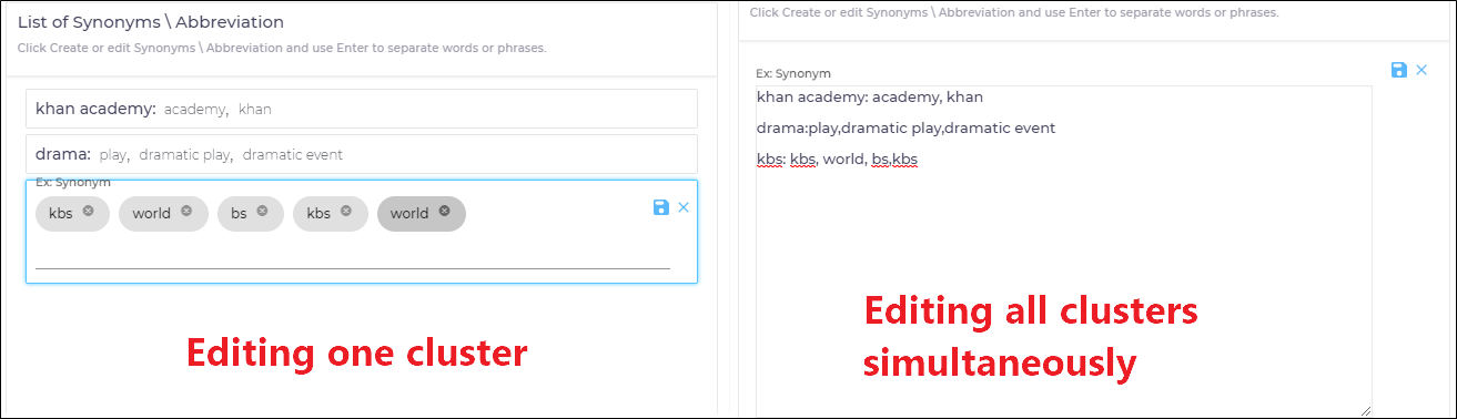 - Enter a keyword and its synonymous phrases, separated by commas, then click Save.