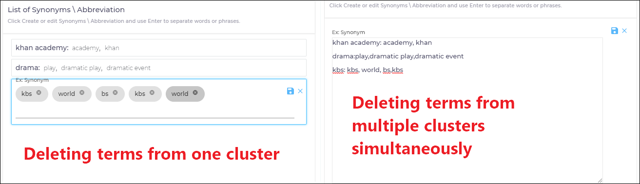 to delete synonyms or abbreviations from a cluster, or remove an entire row to delete the whole cluster.