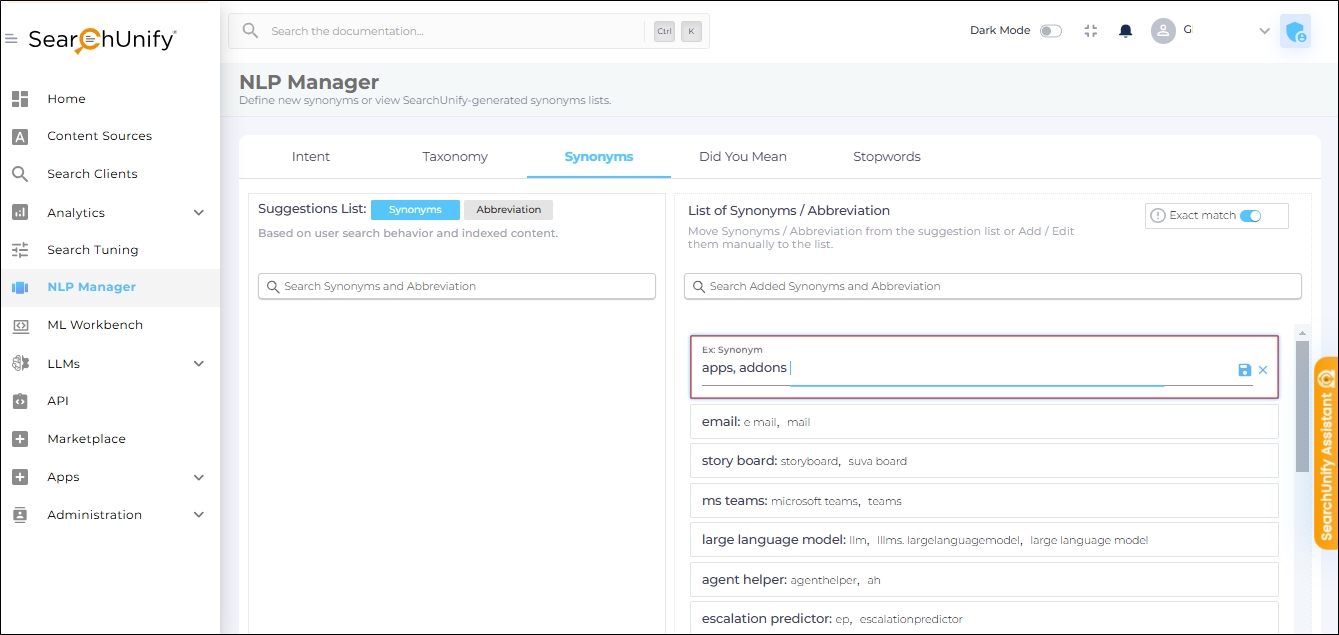 When Exact Match is enabled, multi-word synonyms are treated as exact phrases. For example, "kcs" is a synonym for "knowledge centered service" when Exact Match is on.