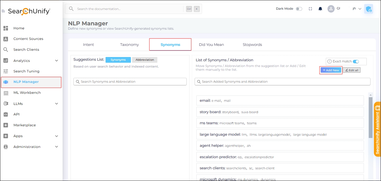 The Synonyms feature enhances the search experience by ensuring that users can find relevant results even if they don't use the exact keywords. For example, users might search for phrases like [run searchunify in salesforce], [set up searchunify in sf], or [get su for sf] when looking for a document titled SearchUnify: Installation Instructions for Salesforce. Thanks to Synonyms in NLP Manager, such variations still lead to the correct document.