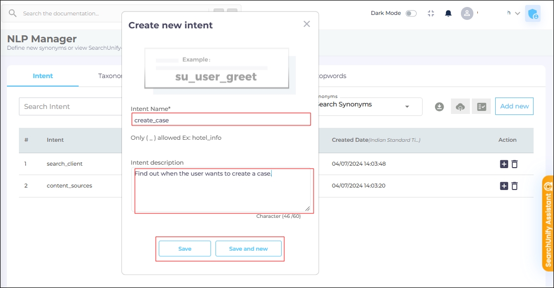 A dialog box will appear. Fill in the Intent Name and optionally provide an Intent Description.